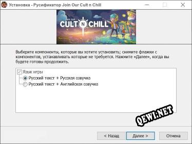 Если вы зашли на эту страницу, вы наверняка искали русификатор для Join Our Cult n Chill. Используя русификатор к этой игре, вы сможете перевести игру на русский язык. Данный файл от автора с ником Reloaded.