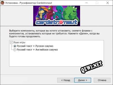 Добро пожаловать на наш сайт QeWi.NET! Если вы хотите играть в Cardstronaut на русском языке, то вы попали по адресу! Здесь вы можете скачать русификатор для версии игры 1.0 и выше. Этот русификатор от ViRiLiTY будет работать и на более поздних версиях.