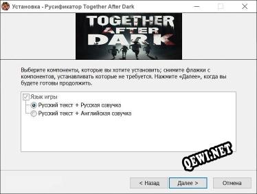 Добрый день! Мы рады приветствовать вас на нашем сайте QeWi.NET, где вы найдете лучшие русификаторы для своих любимых игр! Если вы зашли на эту страницу, вы скорее всего искали рабочий русификатор Together After Dark. Используя русификатор к этой игре, вы сможете перевести игру на русский язык. Доступен русификатор от OUTLAWS.